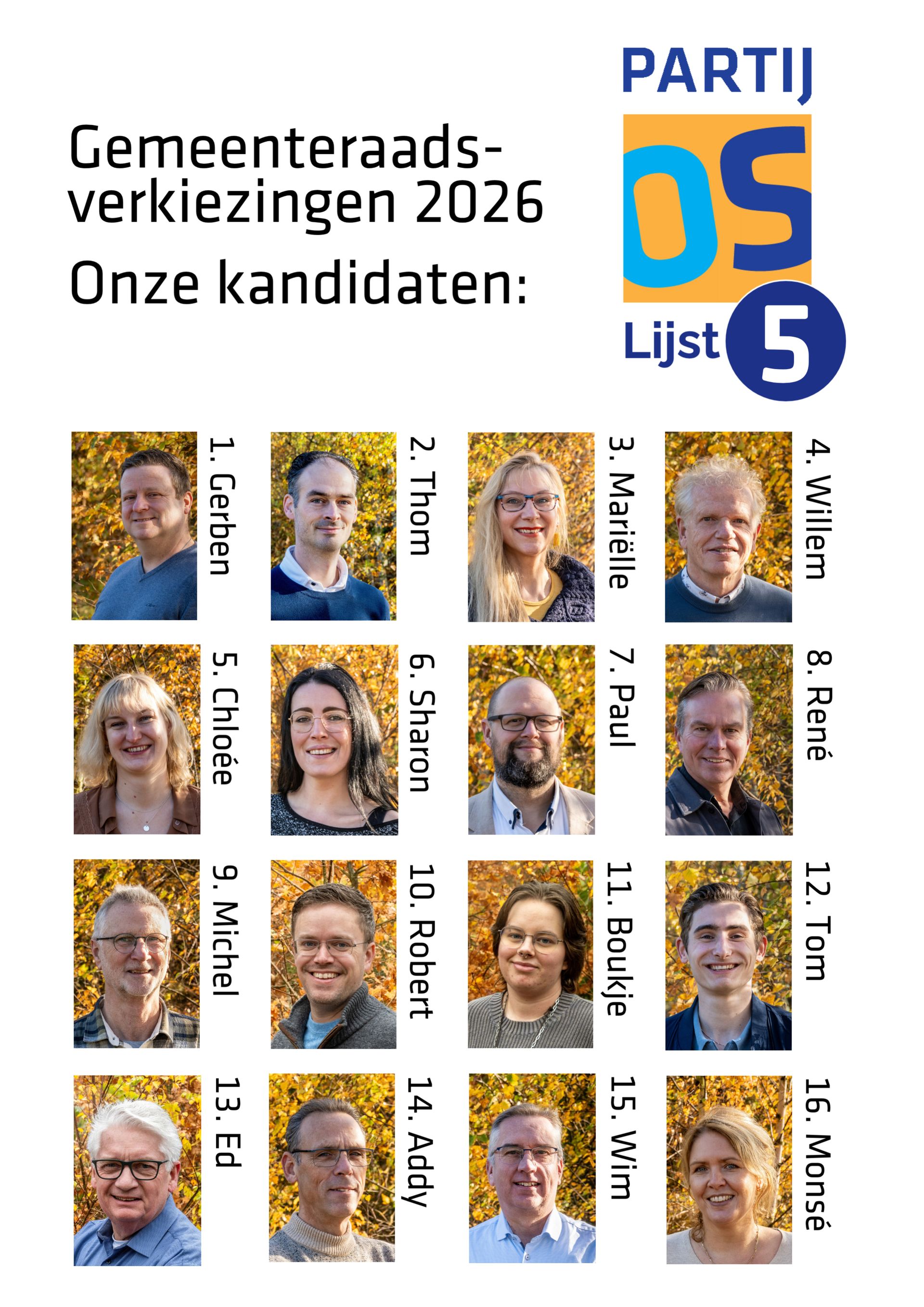 Hieronder vind je de volledige kandidatenlijst waarvoor posters kunnen worden aangevraagd met het nummer van de kandidaat: